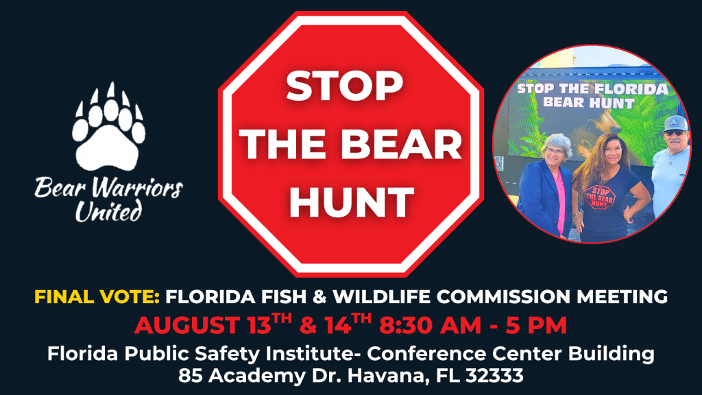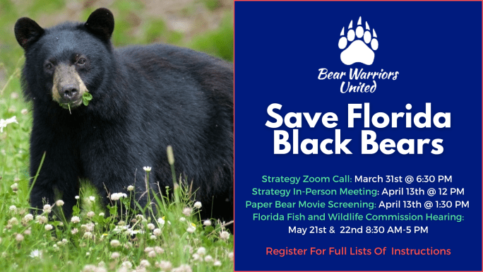 Join the team from Bear Warriors United for an important virtual update and strategy session on the recent changes to Florida’s trapping regulations and the ongoing lawsuit to stop the Florida Fish and Wildlife Conservation Commission from administering the December bear hunt.