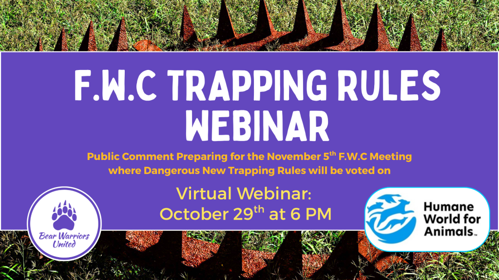 Join Bear Warriors United and Humane World for Animals on Wednesday, October 29th at 6 PM for a virtual webinar on the Florida Fish and Wildlife Conservation Commission’s proposed trapping rule changes, which could have serious consequences for Florida’s wildlife, pets, and communities.